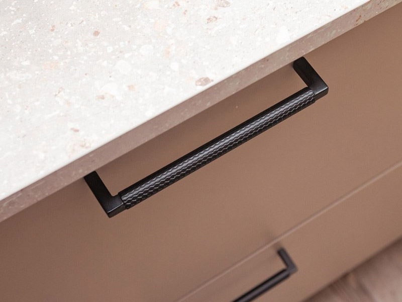 Choć forma uchwytu wydaje się prosta, została subtelnie urozmaicona delikatnymi, poziomymi żłobieniami w górnej części, które nadają mu elegancji i unikalnego wyrazu. To detal, który przyciąga uwagę, nie zaburzając minimalistycznej estetyki całości.