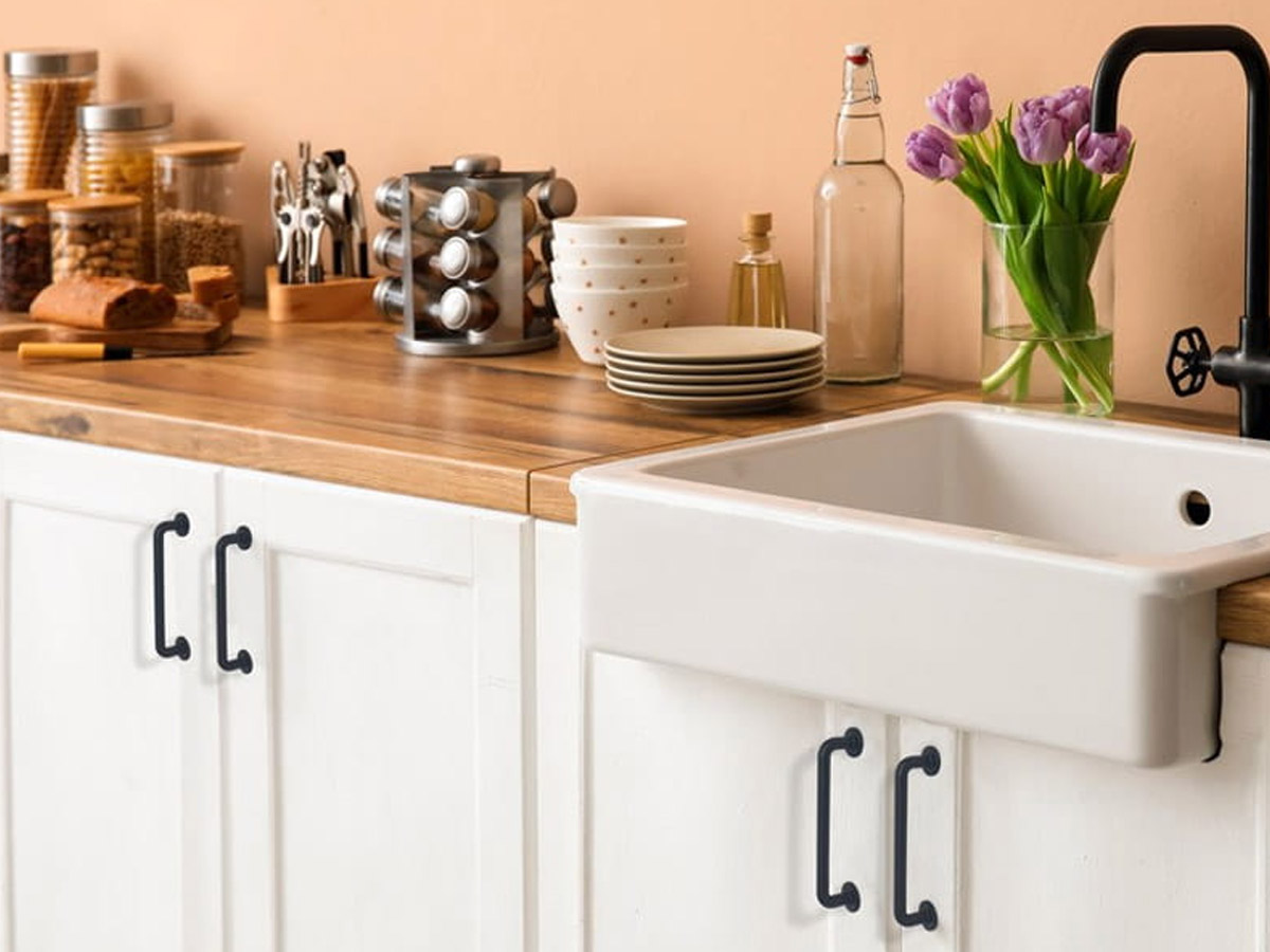 W tego typu aranżacjach dominują roślinne motywy, naturalne materiały oraz kolory ziemi. Uchwyt Daphne, dostępny najczęściej w wykończeniu mosiężnym, tworzy elegancki kontrast dla intensywnych odcieni zieleni – zarówno ciemnych liści, jak i soczystych paproci. Alternatywą bywa kolor miedziany, który wnosi delikatne, ciepłe tony różu, idealnie współgrające z naturalną paletą barw stylu Jungle.