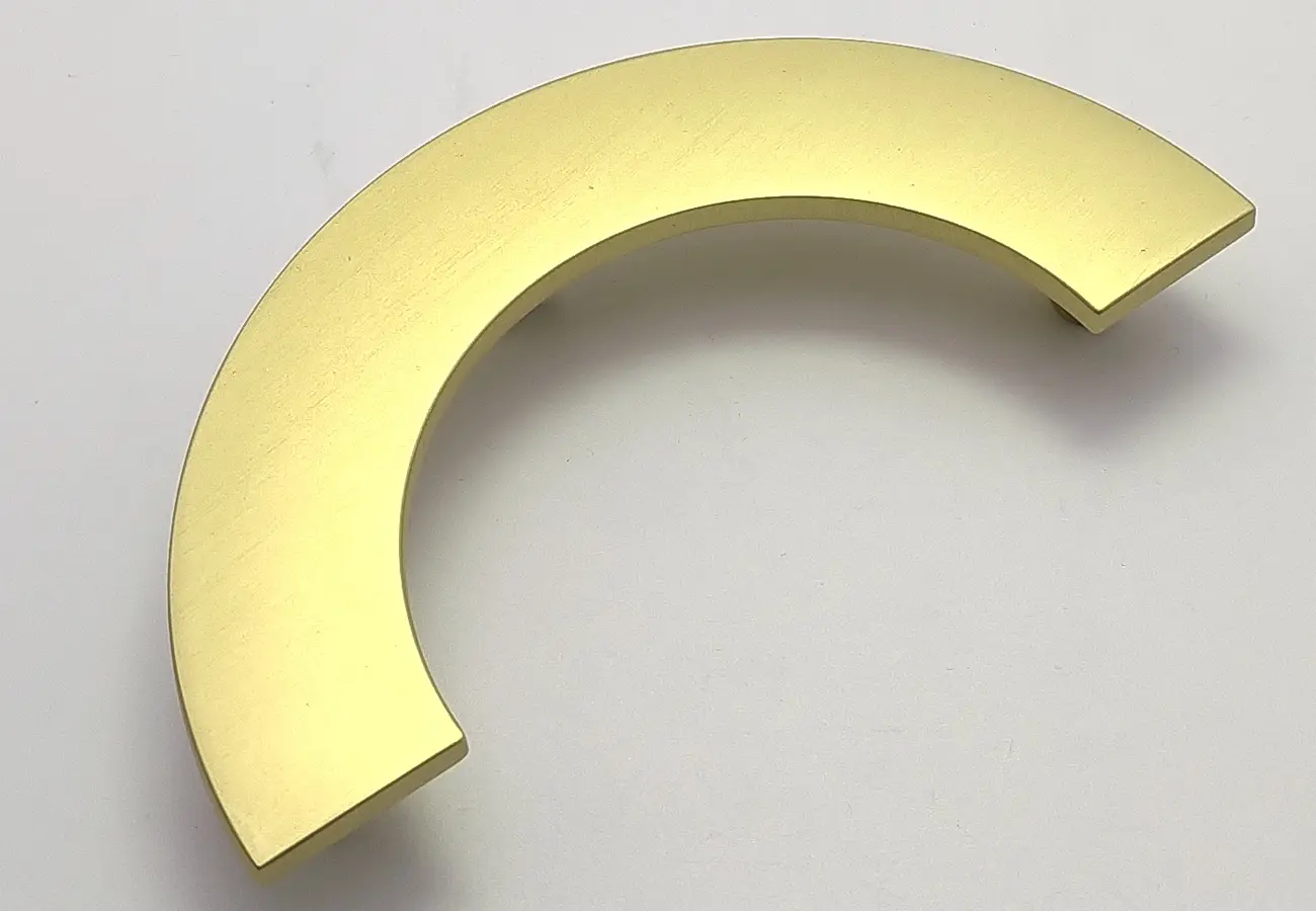 Podstawowa forma uchwytów z tej serii to łagodnie zakrzywiony półokrąg, który jest lekko wypukły i wygodny w chwycie — jego powierzchnia jest gładka, pozbawiona dodatkowych żłobień, dzięki czemu wygląda nowocześnie i elegancko. Taka forma sprawia, że uchwyt nie dominuje wizualnie nad frontem mebla, ale subtelnie go podkreśla, równocześnie oferując pewny uchwyt podczas otwierania.