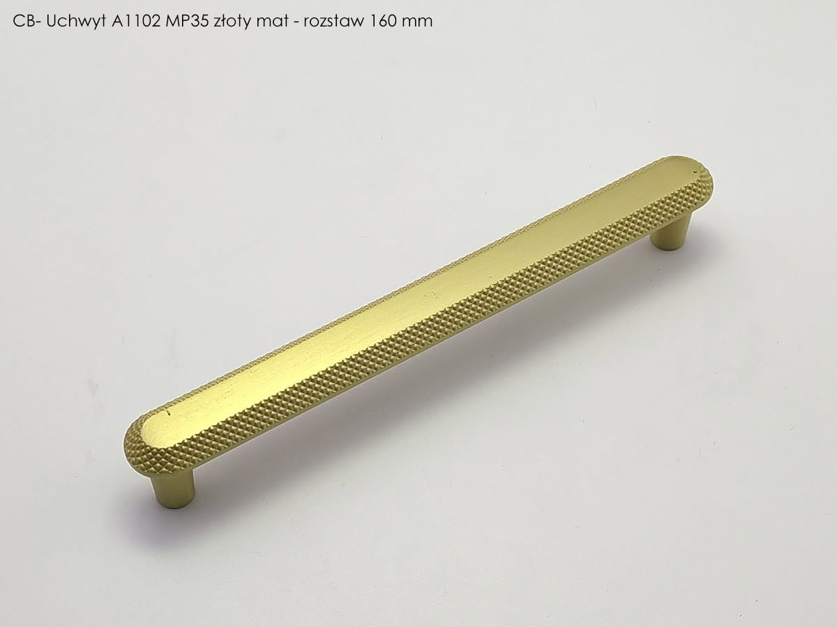 Model A1200 reprezentuje linię uchwytów podłużnych o bardziej rozbudowanej formie, przeznaczoną do mebli o większych frontach. Jego konstrukcja jest prosta, składa się z wydłużonego elementu chwytnego zakończonego lekko zaokrąglonymi końcówkami, które zapewniają komfortowy chwyt i nie obciążają wizualnie frontu mebla. W wariancie złotego matu uchwyt ten ma rozstaw otworów montażowych 224 mm, a jego długość całkowita wynosi 280 mm, przy szerokości korpusu około 28 mm i wysokości około 26 mm, co daje mu zdecydowanie więcej obecności na meblu i czyni go odpowiednim do zabudów kuchennych lub szaf o większych gabarytach . Powierzchnia w wykończeniu złotym macie nadaje mu elegancki, jednocześnie subtelny charakter, który pasuje zarówno do klasycznych, jak i nowoczesnych aranżacji wnętrz.