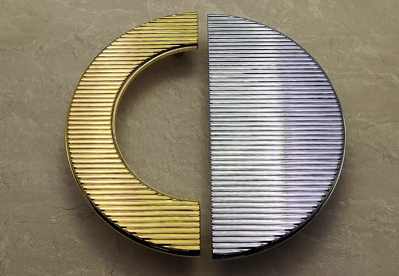 Uchwyty meblowe z serii CEBI 1193 to charakterystyczne półokrągłe elementy o wyraźnie dekoracyjnym, a jednocześnie funkcjonalnym charakterze. Wykonane są z trwałego stopu metali ZnAl, co zapewnia im wysoką odporność na uszkodzenia mechaniczne oraz stabilność podczas codziennego użytkowania. Ich forma opiera się na pełnym, masywnym półkolu, które po zamontowaniu na froncie mebla tworzy wyraźny, lecz harmonijny akcent wizualny. Szczególną cechą tej serii jest ryflowana struktura powierzchni – regularne, podłużne żłobienia biegnące wzdłuż całego łuku uchwytu. Taka faktura nadaje uchwytom elegancki wygląd, wzbogaca efekt gry światła na metalu oraz poprawia komfort chwytu, zapobiegając ślizganiu się dłoni.