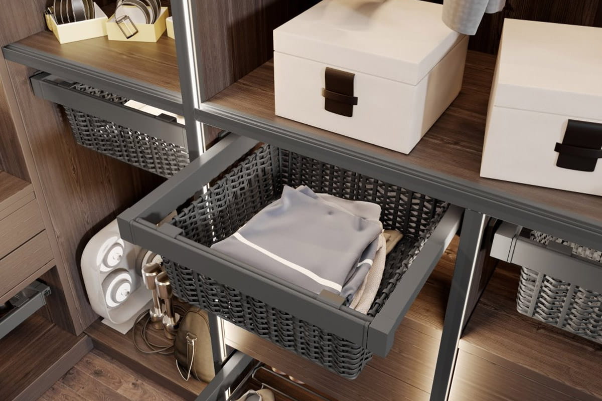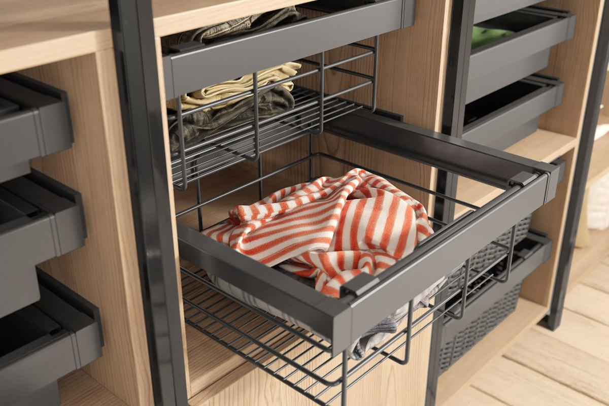 Garderoba Elite to linia eleganckiego i funkcjonalnego wyposażenia do szaf, zaprojektowana tak, by łączyć luksus z przemyślaną organizacją przestrzeni. Kluczowymi komponentami zestawu są wysuwane elementy, które instalowane są wewnątrz korpusów szafy i pozwalają wykorzystać przestrzeń w sposób maksymalnie praktyczny. W skład garderoby Elite wchodzą szuflady z koszami drucianymi. Te kosze są ażurowe, co daje dobrą wentylację przechowywanej odzieży czy bielizny, i dostępne są w różnych szerokościach (np. 600 mm, 900 mm) oraz w kilku kolorach, m.in. białym i antracytowym.