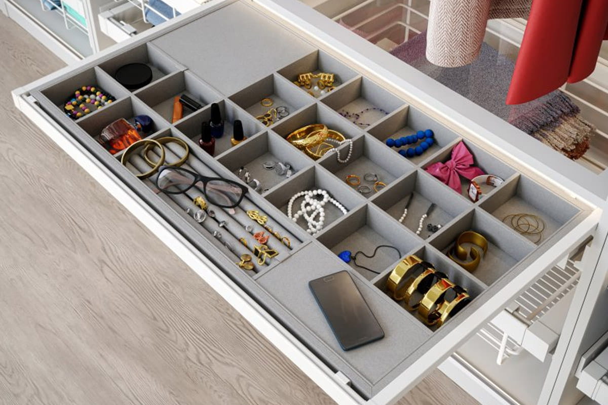 GTV Elite organizer na biżuterię Szuflada ELITE przeznaczona do przechowywania biżuterii została wyposażona w miękką, aksamitną wyściółkę oraz liczne przegródki, które zabezpieczają delikatne akcesoria i pomagają utrzymać idealny porządek. Mniejsze sekcje świetnie sprawdzą się na kolczyki czy pierścionki, natomiast większe z łatwością pomieszczą ozdoby do włosów, bransoletki czy okulary przeciwsłoneczne. Organizer oferowany jest w dwóch kolorach i czterech rozmiarach, a jego szerokość można dopasować do korpusu mebla. Mechanizm cichego domyku oraz pełny wysuw zapewniają wyjątkowy komfort użytkowania. W komplecie znajdują się: dwie prowadnice dolnego montażu, dwie osłony prowadnic, dwa elementy mocujące, rama z regulacją szerokości ±58 mm, szuflada z przegródkami oraz zestaw wkrętów.