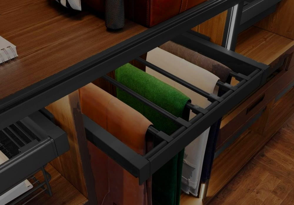 Kolejnym elementem wyposażenia Elite są szuflady na obuwie. To specjalne, głębokie szuflady (np. metalowe), przystosowane do przechowywania butów w sposób uporządkowany. Przykładem może być metalowa szuflada na obuwie w kolorze antracytu. Ponadto garderoba Elite oferuje wysuwane wieszaki na spodnie – komponent, który zapobiega gnieceniu spodni. Wieszak jest wyposażony w pełny wysuw i mechanizm cichego domykania, co sprawia, że dostęp do spodni jest wygodny i niehałaśliwy.