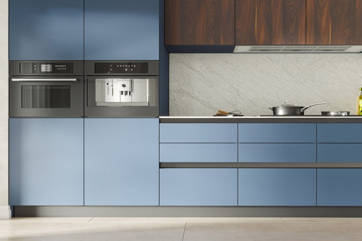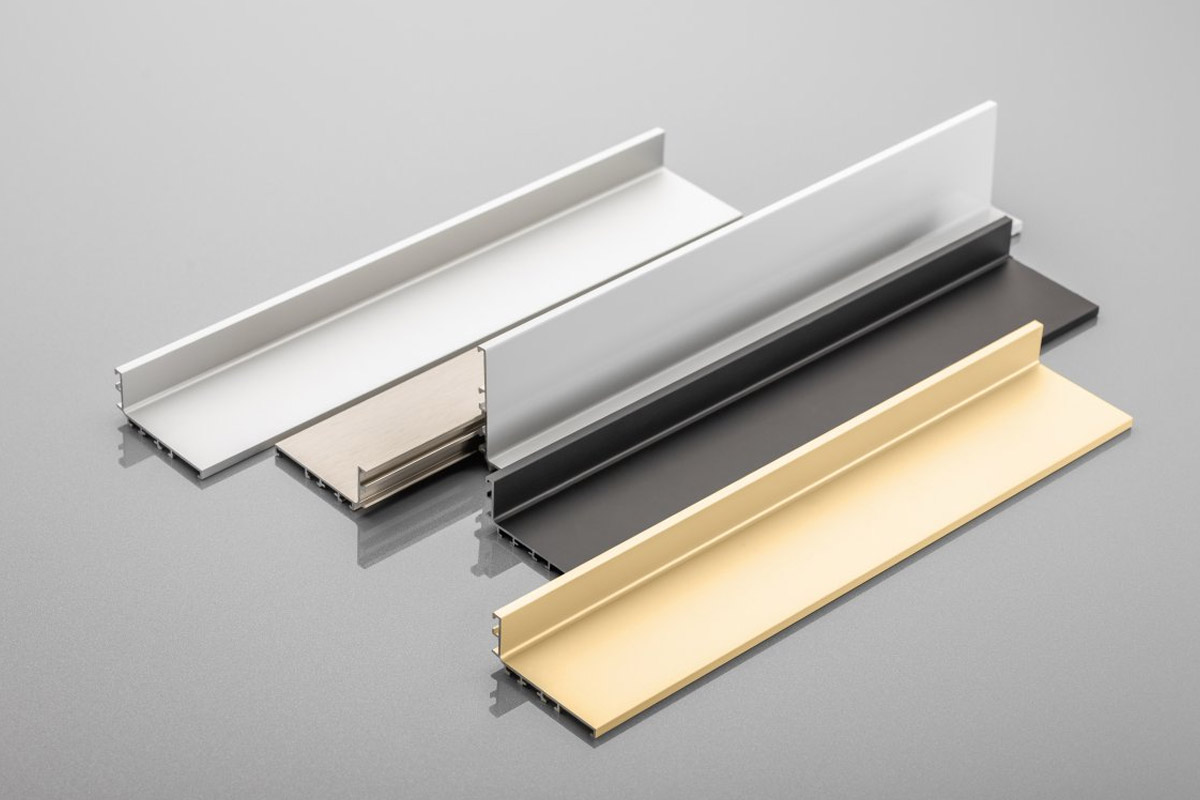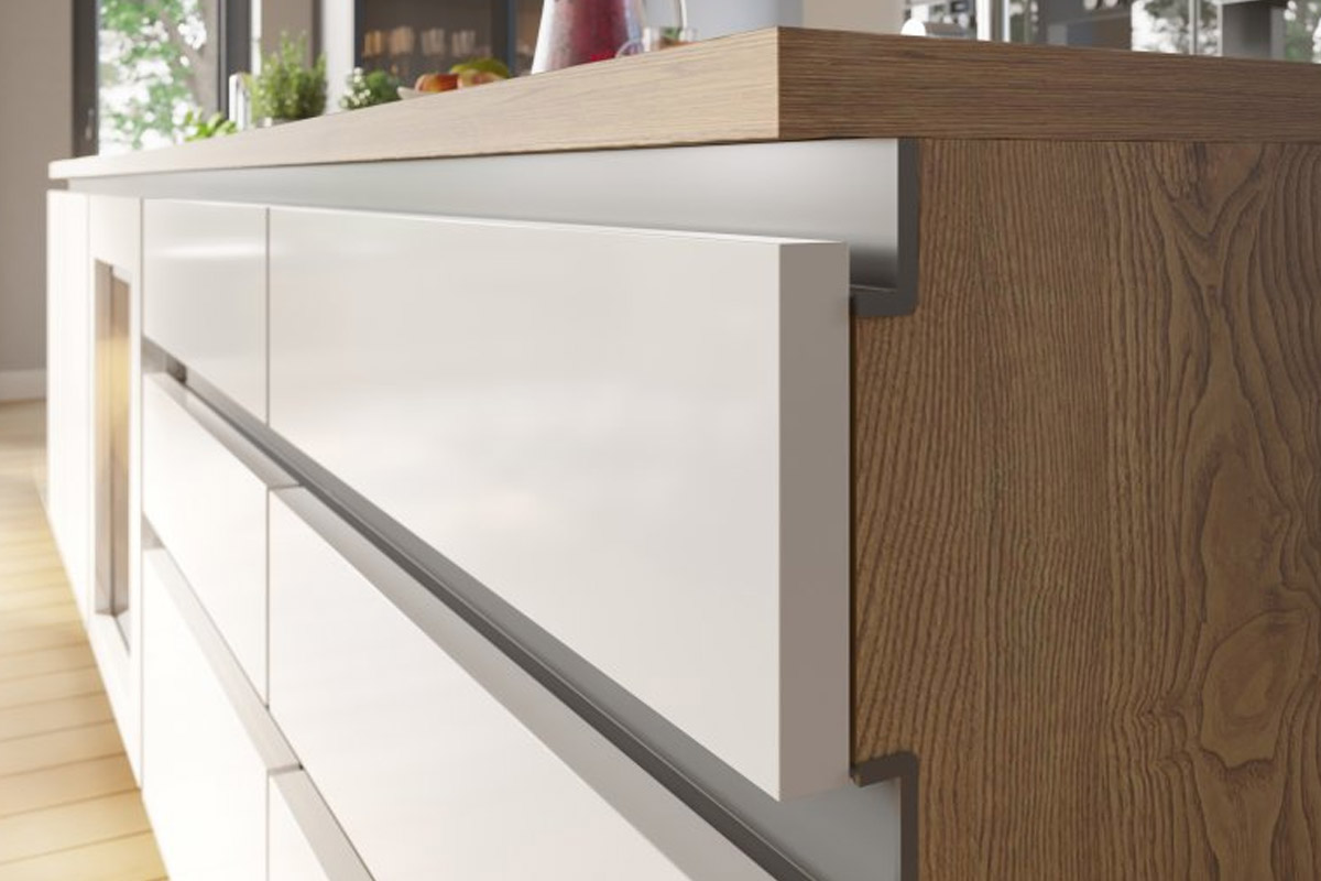 VELLO opiera się na specjalnych aluminiowych profilach montowanych poziomo lub pionowo w konstrukcji mebla. Profile te tworzą dyskretną przestrzeń, za którą użytkownik może chwycić front i go otworzyć. W zależności od potrzeb i układu zabudowy stosuje się różne typy profili – inne pod szuflady, inne pod szafki górne, dolne lub wysokie słupki. Dzięki temu system jest elastyczny i można go dopasować zarówno do prostych, jak i bardziej rozbudowanych projektów meblowych.