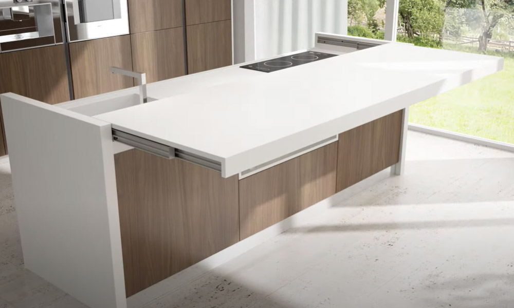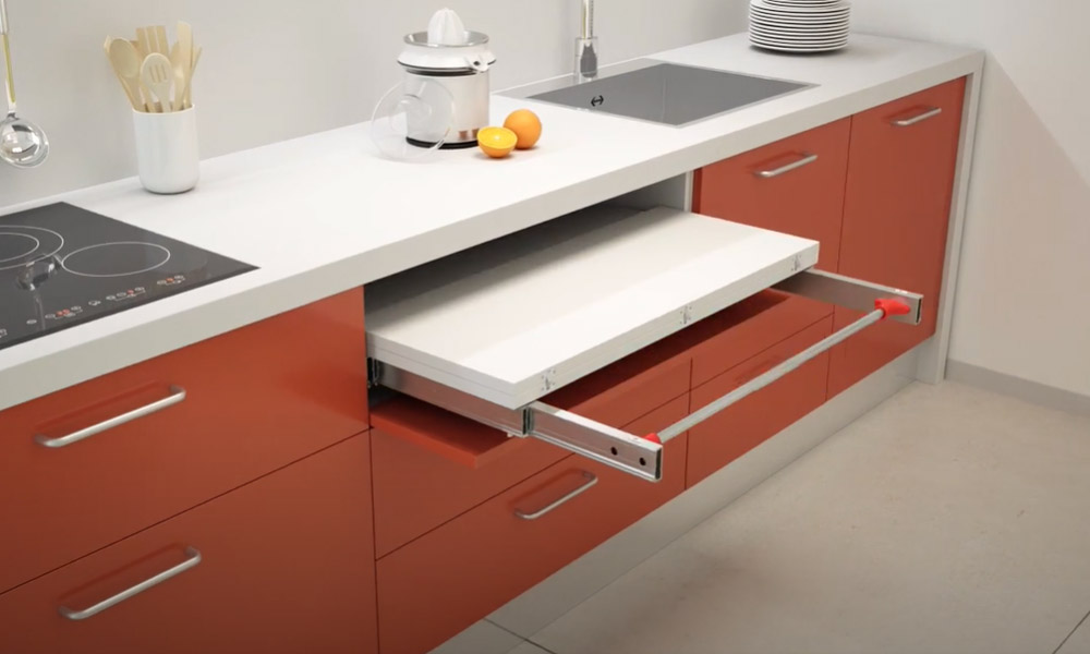 Mechanizm blatu SNACKPrzesuwny blat rewolucjonizuje koncepcję jednostki kuchennej. Wysuwany element (który w razie potrzeby może zakrywać palniki, zlew itp.) można łatwo schować, aby nadać kuchni schludny, nowoczesny design. Prowadnice są częściowo zatopione w panelu bocznym i ukryte pod górną częścią, którą można łatwo wysunąć, aby stworzyć poręczny blat po przeciwnej stronie. Cechy produktu:* szerokość szafki: 2000, 2600 mm * głębokość szafki: min.800 mm * wykończenie: aluminium anodowane * udźwig 80 kg * prowadnice kulkowe * zestaw nie zawiera blatu * rysunek techniczny zobacz |