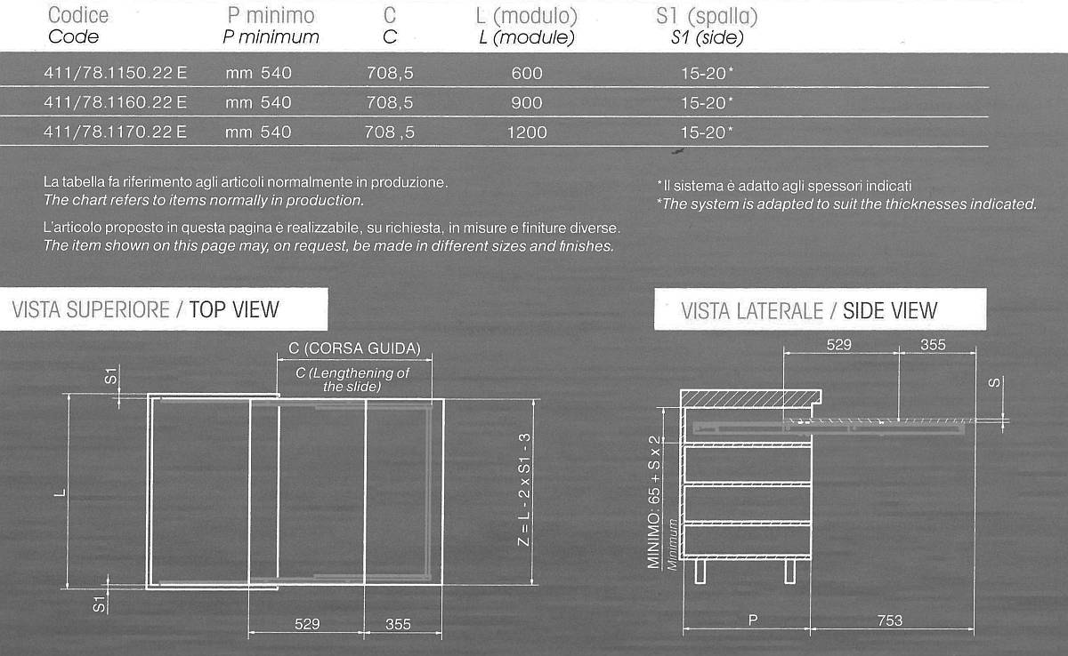 Mechanizm blatu MENSOLA PARTYMENSOLA PARTY, zaprojektowany przez Arch. Giulio Manzoni we współpracy z Centrum Badań i Rozwoju ATIM zmienia koncepcję stołu. Dzięki doświadczeniu zdobytemu podczas projektowania stołu imprezowego, który od lat cieszy się wielkim powodzeniem, seria PARTY Mensola została zaprojektowana do montażu w półce o dowolnej długości, aby stworzyć duży stół (do 1600 mm) i nośność (do 100 kg równomiernie rozmieszczone) stół ze zintegrowanymi teleskopowymi nogami. Ten genialny projekt stołu został opracowany w celu maksymalizacji oszczędności miejsca na mniejszych obszarach lub tam, gdzie wymagane jest środowisko bez bałaganu. Zaprojektowany tak, aby dobrze schować się za frontem szuflady, system ten po prostu wysuwa się i daje wybór szerokości stołu. Ten konkretny model ma dodatkowe ubezpieczenie teleskopowych nóg zaprojektowanych w celu zmaksymalizowania stabilności! Wszechstronny blat, idealny do małych kuchni, aneksów kuchennych, pralni, biur, pokojów zabaw i sypialni dla dzieci. Najnowsze aplikacje obejmowały również przyczepy kempingowe i przyczepy kempingowe. Cechy produktu:* szerokość szafki: 600, 900, 1200 mm * głębokość szafki: min.502 mm * wykończenie: aluminium anodowane * udźwig 100 kg * prowadnice kulkowe * zestaw nie zawiera blatu * rysunek techniczny zobacz |