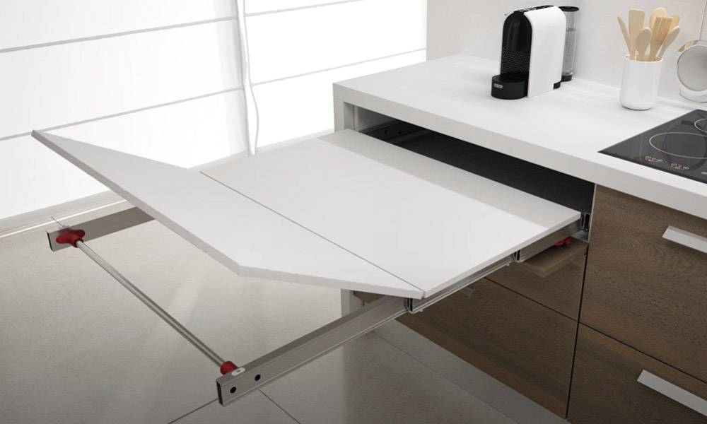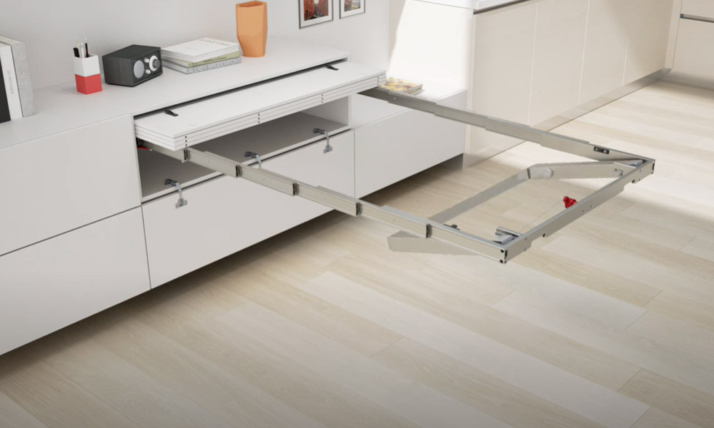 Mechanizm blatu T-ABLE/ T-ABLE XLT-ABLE to nowy system do wyciągania stołu półwyspowego, nawet o dużych wymiarach (do 900 mm głębokości), z przedziału szuflady. Teleskopowa składana noga zapewnia również duży ładunek i stabilność (ponad 100 kg), spełniając najwyższe standardy bezpieczeństwa. * szerokość szafki: 600, 900, 1200 mm * głębokość szafki: min.550 mm * wysuw długość: T-ABLE do 900mm / T-ABLE XL do 1350mm * wykończenie: aluminium anodowane * udźwig 100 kg * prowadnice kulkowe * zestaw nie zawiera zawiasów do blatu i blatu * rysunek techniczny zobacz * dedykowany zawias do blatów składanych 2.8029912.11 |