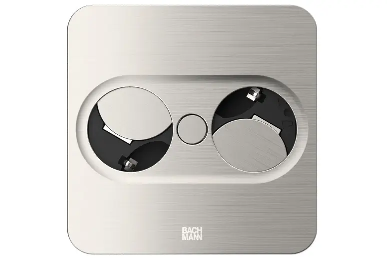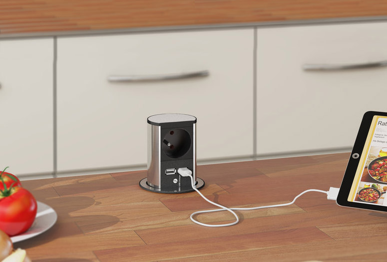 BACHMANN - Gniazdo TWIST na biuro, do pokoju dziennego i do kuchni. Dzięki kompaktowej budowie i małej głębokości montażu łatwo zintegrować go z blatem biurka i blatem kuchennym. Kabel zasilający jest poprowadzony blisko obudowy, głębokość instalacji to tylko ok.40mm, więc urządzenie może być łatwo instalowane nad szufladami. Po użyciu, wystarczy obrócić pokrywę i gniazdka znikają pod nią.