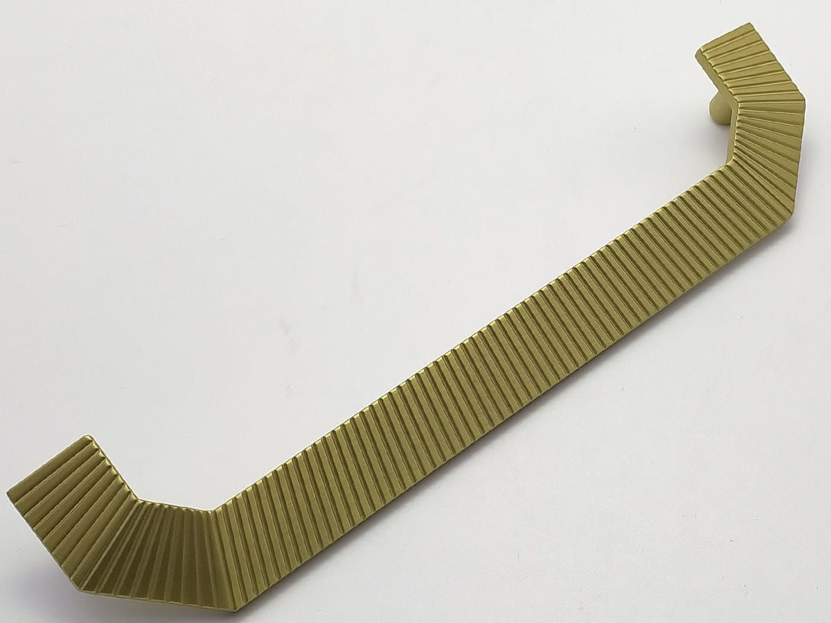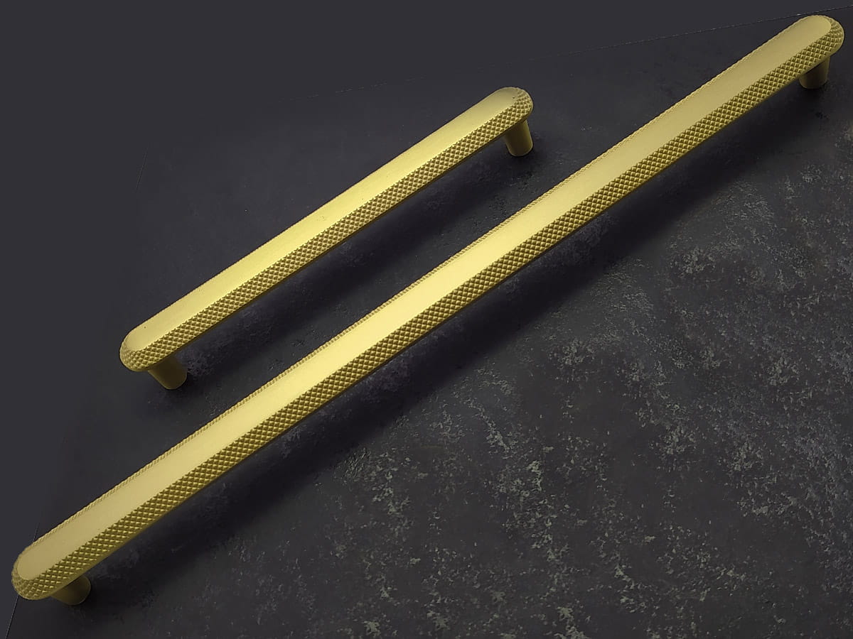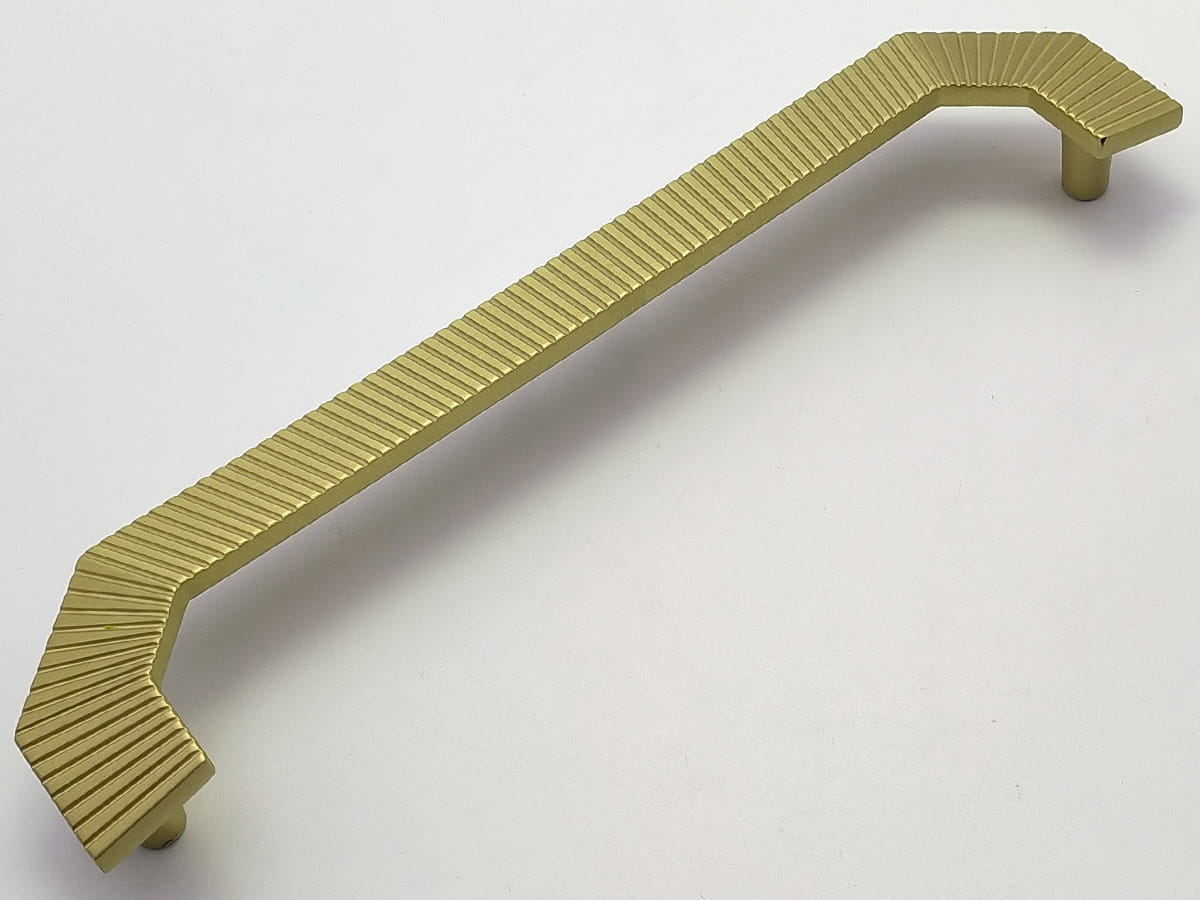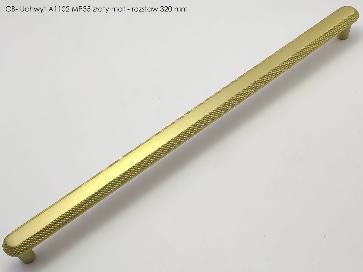 Model A1200 reprezentuje linię uchwytów podłużnych o bardziej rozbudowanej formie, przeznaczoną do mebli o większych frontach. Jego konstrukcja jest prosta, składa się z wydłużonego elementu chwytnego zakończonego lekko zaokrąglonymi końcówkami, które zapewniają komfortowy chwyt i nie obciążają wizualnie frontu mebla. W wariancie złotego matu uchwyt ten ma rozstaw otworów montażowych 224 mm, a jego długość całkowita wynosi 280 mm, przy szerokości korpusu około 28 mm i wysokości około 26 mm, co daje mu zdecydowanie więcej obecności na meblu i czyni go odpowiednim do zabudów kuchennych lub szaf o większych gabarytach . Powierzchnia w wykończeniu złotym macie nadaje mu elegancki, jednocześnie subtelny charakter, który pasuje zarówno do klasycznych, jak i nowoczesnych aranżacji wnętrz.
