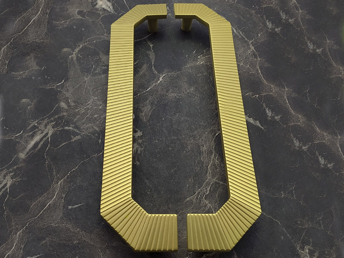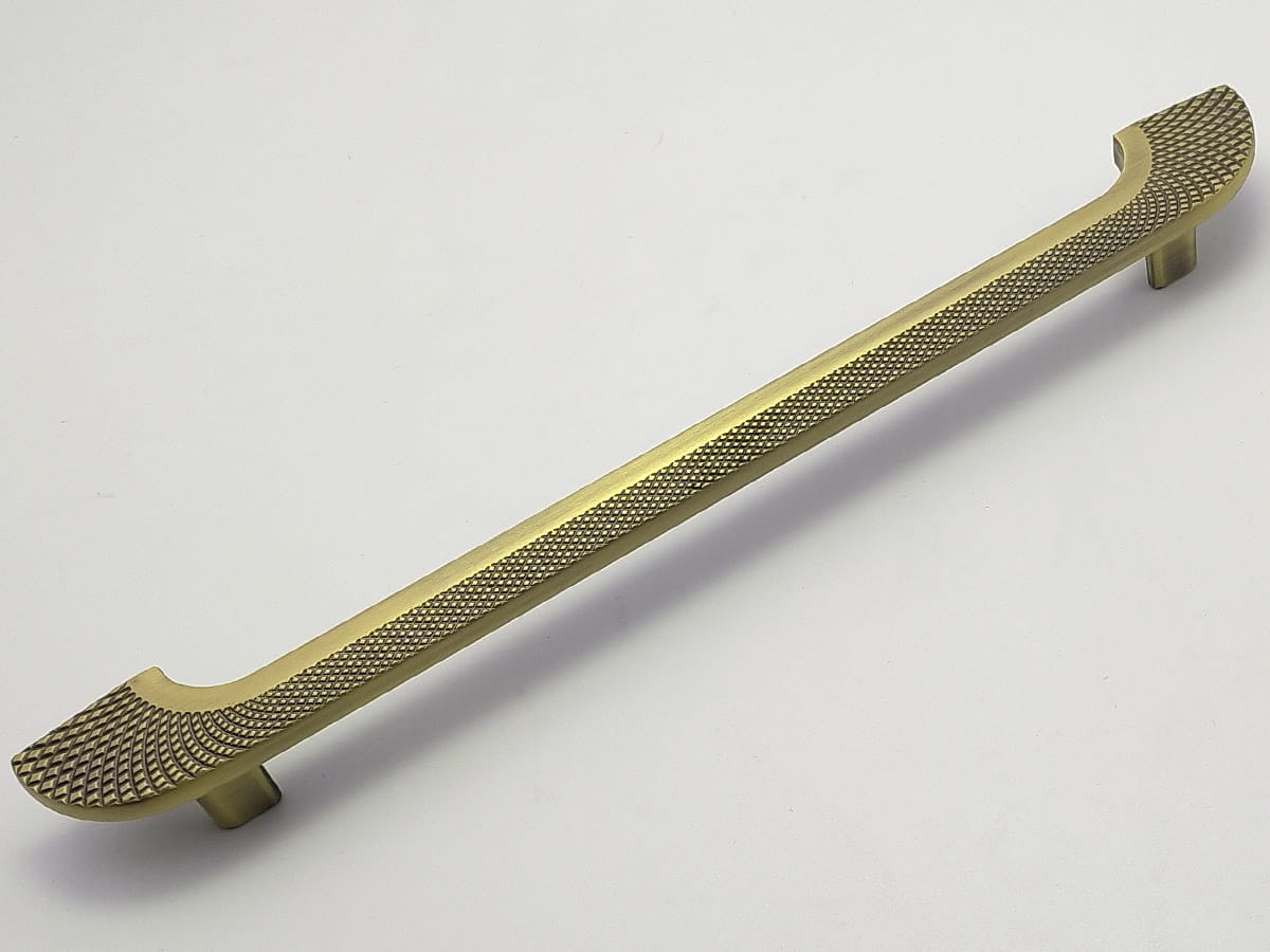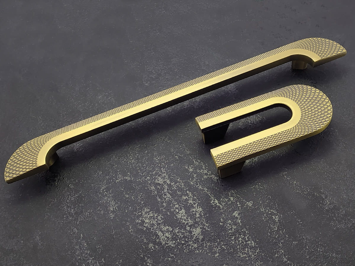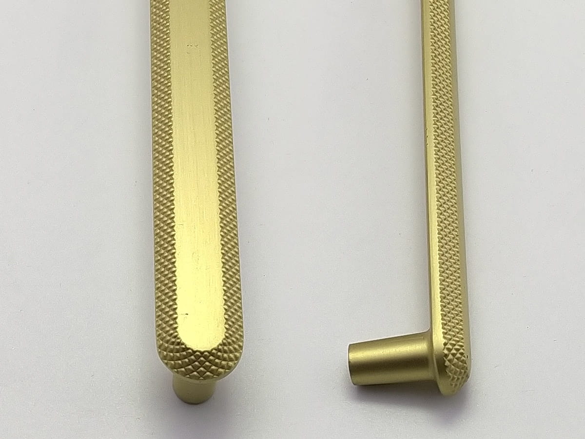 Model A1200 reprezentuje linię uchwytów podłużnych o bardziej rozbudowanej formie, przeznaczoną do mebli o większych frontach. Jego konstrukcja jest prosta, składa się z wydłużonego elementu chwytnego zakończonego lekko zaokrąglonymi końcówkami, które zapewniają komfortowy chwyt i nie obciążają wizualnie frontu mebla. W wariancie złotego matu uchwyt ten ma rozstaw otworów montażowych 224 mm, a jego długość całkowita wynosi 280 mm, przy szerokości korpusu około 28 mm i wysokości około 26 mm, co daje mu zdecydowanie więcej obecności na meblu i czyni go odpowiednim do zabudów kuchennych lub szaf o większych gabarytach . Powierzchnia w wykończeniu złotym macie nadaje mu elegancki, jednocześnie subtelny charakter, który pasuje zarówno do klasycznych, jak i nowoczesnych aranżacji wnętrz.