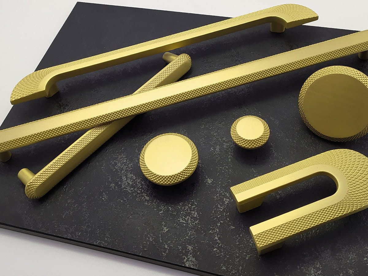 W przeciwieństwie do A1200, uchwyt A4200 to kompaktowa propozycja o mniejszych wymiarach i przeznaczeniu bardziej uniwersalnym, szczególnie do frontów o ograniczonej szerokości albo jako uzupełnienie mniejszych elementów zabudowy. Jego rozstaw otworów montażowych wynosi 32 mm, przy całkowitej długości około 100 mm, co daje mu subtelną obecność i sprawia, że jego forma nie dominuje nad linią mebla . Podobnie jak A1200, model ten jest dostępny w wykończeniu złotego matu, które podkreśla metaliczny charakter detalu, a jednocześnie harmonizuje z różnymi powierzchniami frontów – od jasnych po ciemniejsze odcienie.