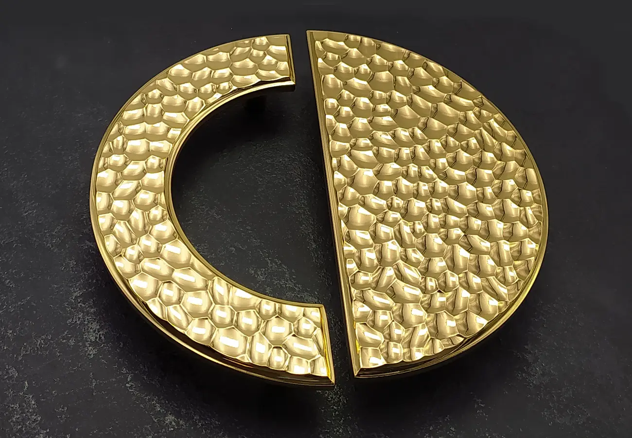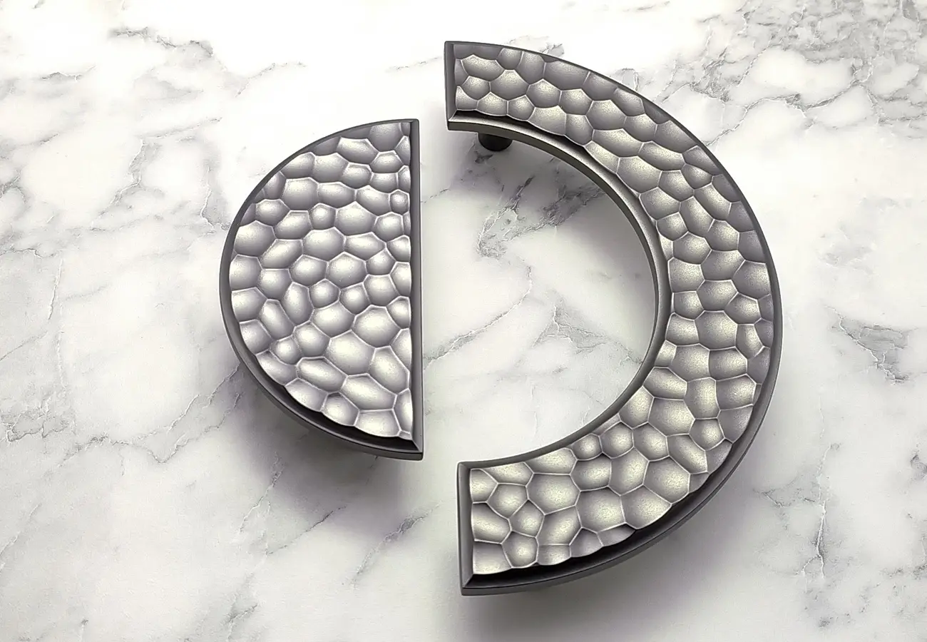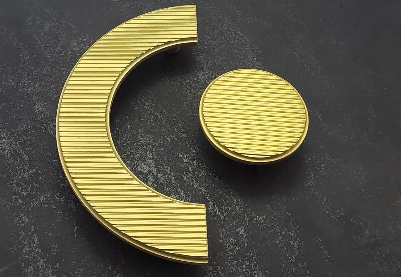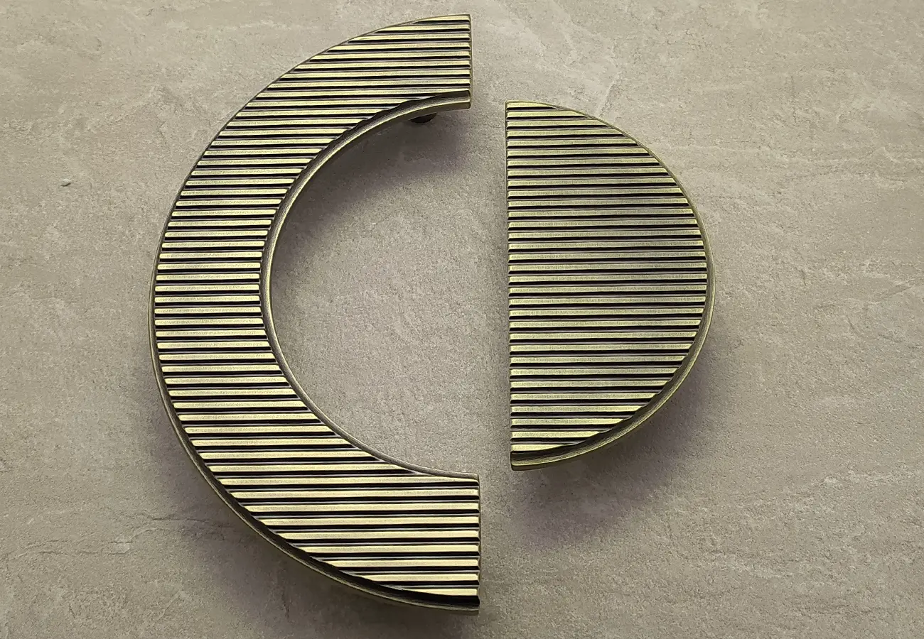 Uchwyty meblowe z serii CEBI 1193 to charakterystyczne półokrągłe elementy o wyraźnie dekoracyjnym, a jednocześnie funkcjonalnym charakterze. Wykonane są z trwałego stopu metali ZnAl, co zapewnia im wysoką odporność na uszkodzenia mechaniczne oraz stabilność podczas codziennego użytkowania. Ich forma opiera się na pełnym, masywnym półkolu, które po zamontowaniu na froncie mebla tworzy wyraźny, lecz harmonijny akcent wizualny. Szczególną cechą tej serii jest ryflowana struktura powierzchni – regularne, podłużne żłobienia biegnące wzdłuż całego łuku uchwytu. Taka faktura nadaje uchwytom elegancki wygląd, wzbogaca efekt gry światła na metalu oraz poprawia komfort chwytu, zapobiegając ślizganiu się dłoni.