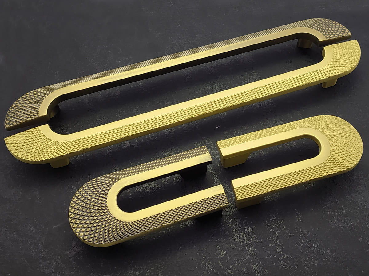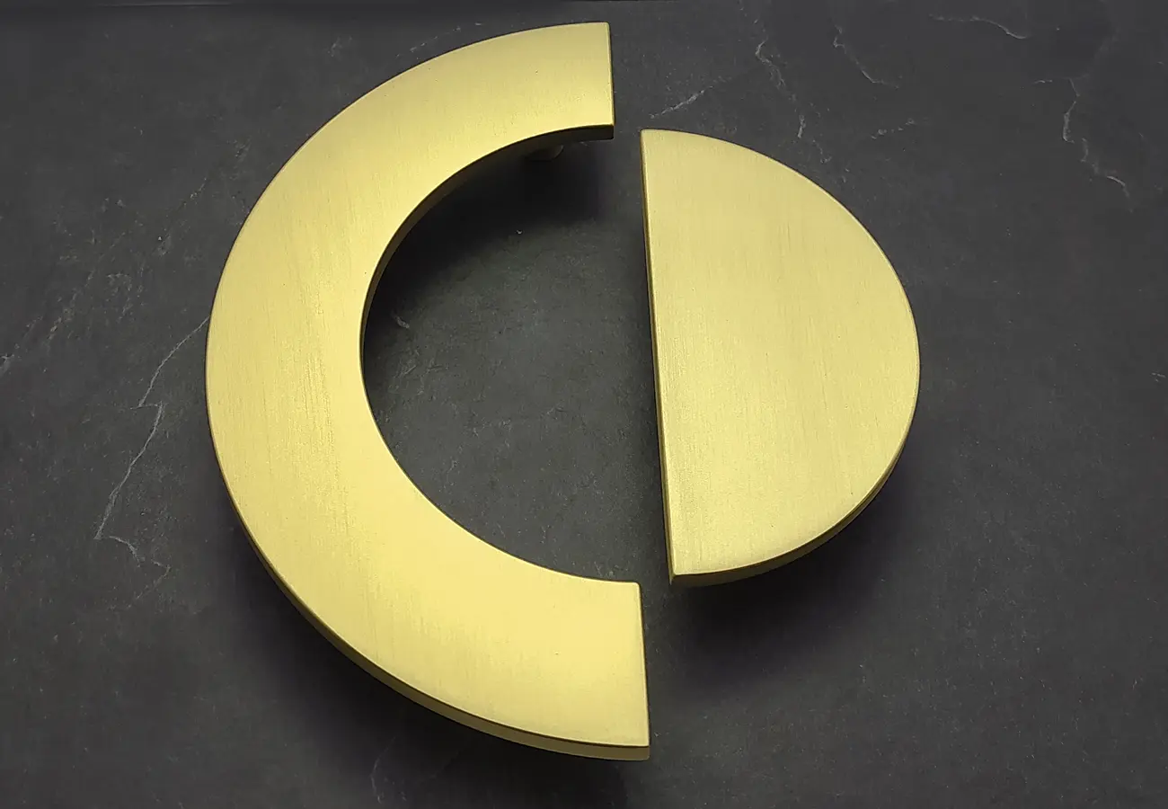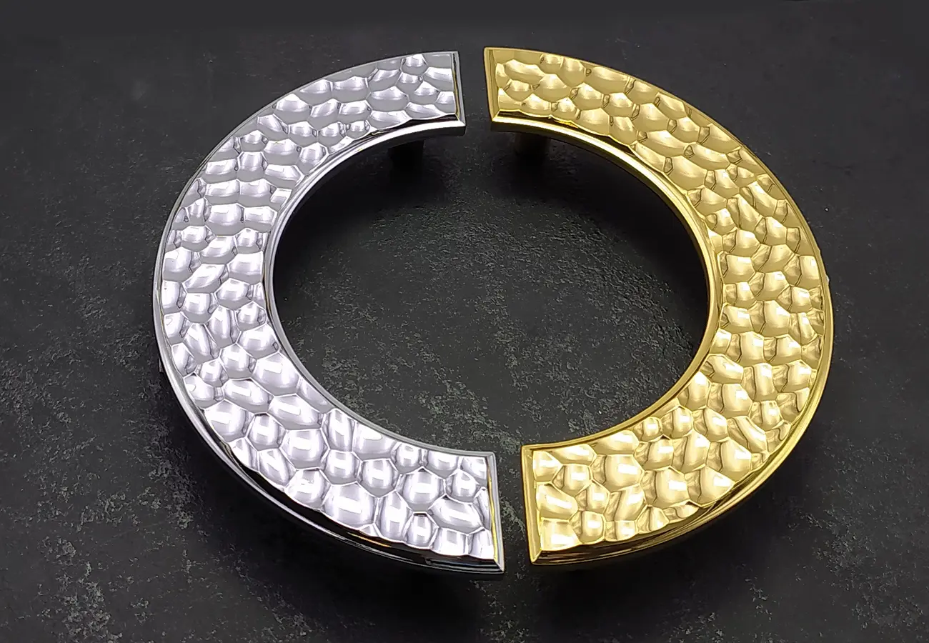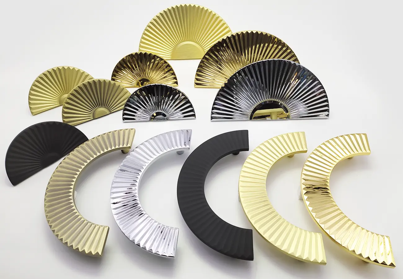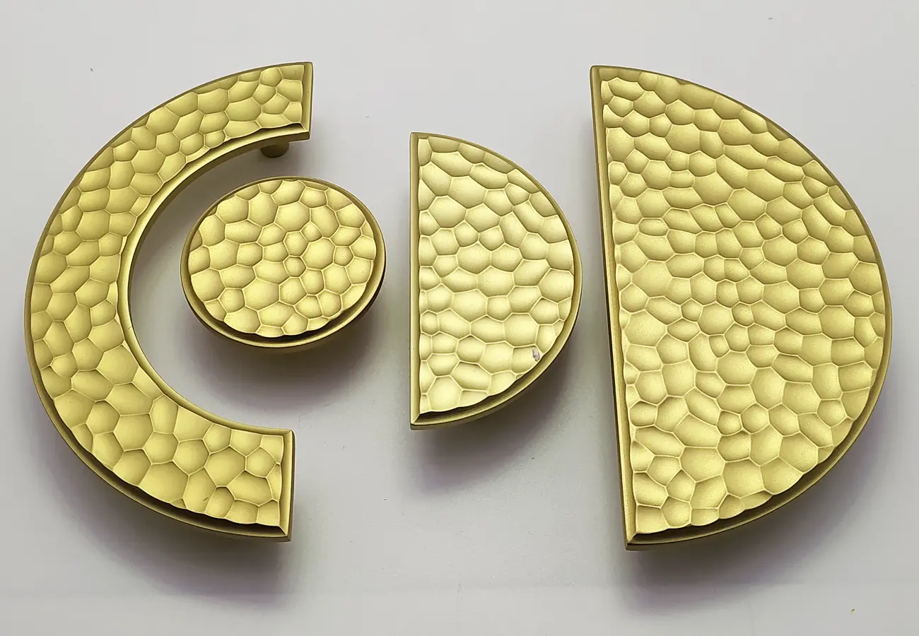 Uchwyty meblowe z serii CEBI 1193 to charakterystyczne półokrągłe elementy o wyraźnie dekoracyjnym, a jednocześnie funkcjonalnym charakterze. Wykonane są z trwałego stopu metali ZnAl, co zapewnia im wysoką odporność na uszkodzenia mechaniczne oraz stabilność podczas codziennego użytkowania. Ich forma opiera się na pełnym, masywnym półkolu, które po zamontowaniu na froncie mebla tworzy wyraźny, lecz harmonijny akcent wizualny. Szczególną cechą tej serii jest ryflowana struktura powierzchni – regularne, podłużne żłobienia biegnące wzdłuż całego łuku uchwytu. Taka faktura nadaje uchwytom elegancki wygląd, wzbogaca efekt gry światła na metalu oraz poprawia komfort chwytu, zapobiegając ślizganiu się dłoni.