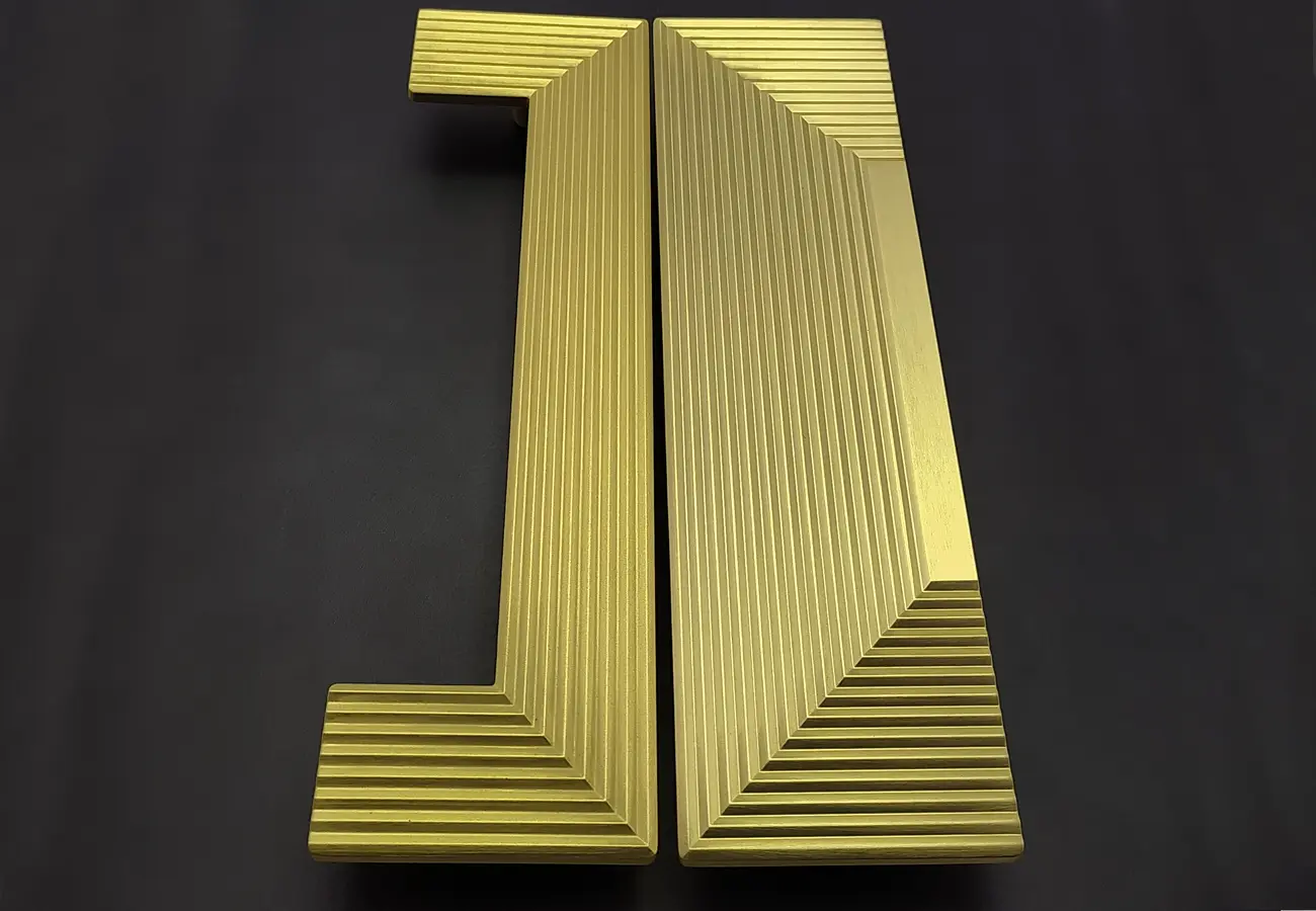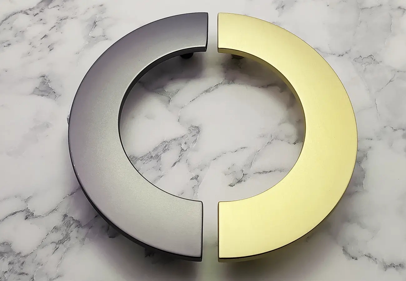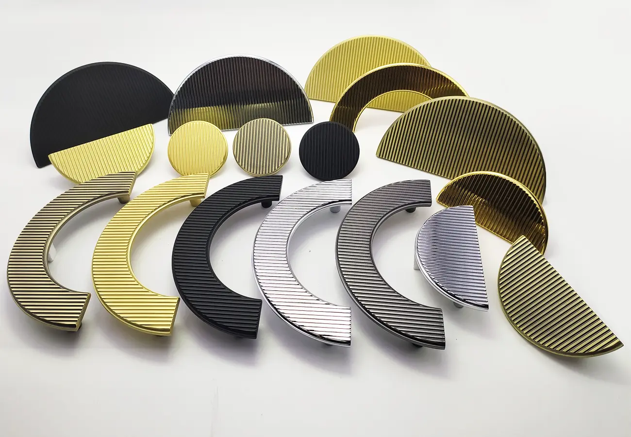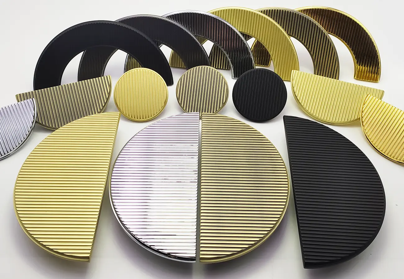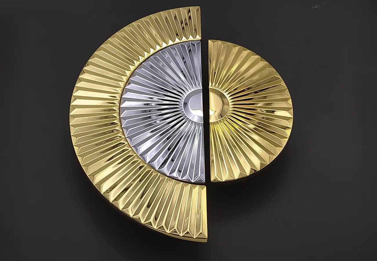 Uchwyty meblowe z serii CEBI 1193 to charakterystyczne półokrągłe elementy o wyraźnie dekoracyjnym, a jednocześnie funkcjonalnym charakterze. Wykonane są z trwałego stopu metali ZnAl, co zapewnia im wysoką odporność na uszkodzenia mechaniczne oraz stabilność podczas codziennego użytkowania. Ich forma opiera się na pełnym, masywnym półkolu, które po zamontowaniu na froncie mebla tworzy wyraźny, lecz harmonijny akcent wizualny. Szczególną cechą tej serii jest ryflowana struktura powierzchni – regularne, podłużne żłobienia biegnące wzdłuż całego łuku uchwytu. Taka faktura nadaje uchwytom elegancki wygląd, wzbogaca efekt gry światła na metalu oraz poprawia komfort chwytu, zapobiegając ślizganiu się dłoni.