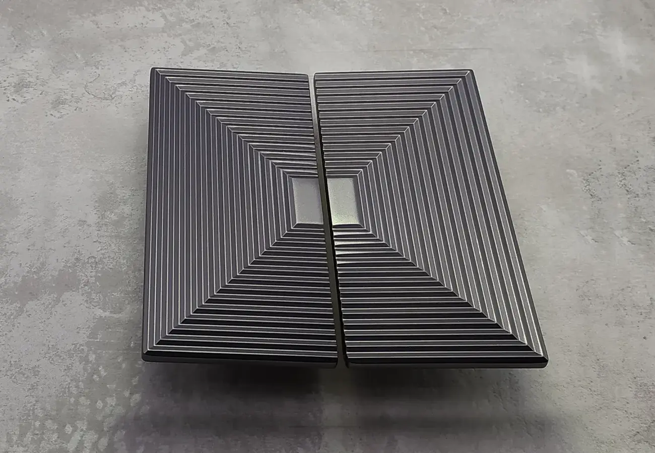 Faktura i kolorystyka uchwytów z serii 1194 sprawiają, że są one nie tylko praktycznym elementem otwierającym, lecz także dekoracyjnym detalem meblowym — szczególnie wtedy, gdy zastosuje się je w zestawieniu parami (np. dwa uchwyty na szerszym froncie), tworząc symetryczny, geometryczny motyw.