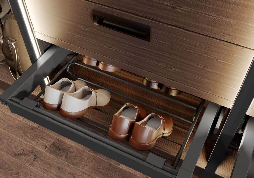 Kolejnym elementem wyposażenia Elite są szuflady na obuwie. To specjalne, głębokie szuflady (np. metalowe), przystosowane do przechowywania butów w sposób uporządkowany. Przykładem może być metalowa szuflada na obuwie w kolorze antracytu. Ponadto garderoba Elite oferuje wysuwane wieszaki na spodnie – komponent, który zapobiega gnieceniu spodni. Wieszak jest wyposażony w pełny wysuw i mechanizm cichego domykania, co sprawia, że dostęp do spodni jest wygodny i niehałaśliwy.