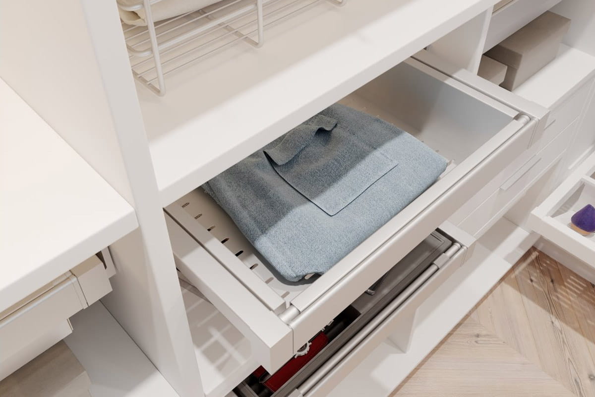 Garderoba Elite to linia eleganckiego i funkcjonalnego wyposażenia do szaf, zaprojektowana tak, by łączyć luksus z przemyślaną organizacją przestrzeni. Kluczowymi komponentami zestawu są wysuwane elementy, które instalowane są wewnątrz korpusów szafy i pozwalają wykorzystać przestrzeń w sposób maksymalnie praktyczny. W skład garderoby Elite wchodzą szuflady z koszami drucianymi. Te kosze są ażurowe, co daje dobrą wentylację przechowywanej odzieży czy bielizny, i dostępne są w różnych szerokościach (np. 600 mm, 900 mm) oraz w kilku kolorach, m.in. białym i antracytowym.