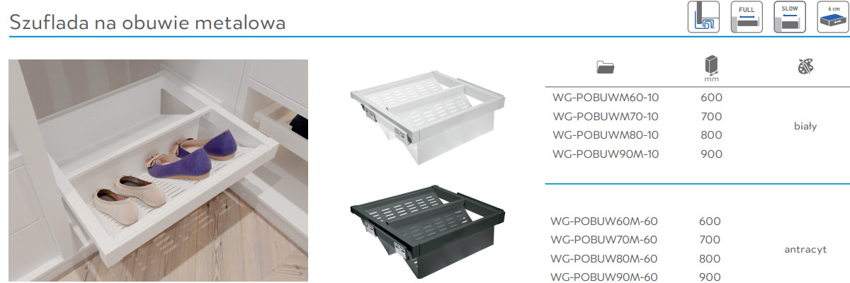 Szuflada metalowa ELITE przeznaczona do przechowywania obuwia świetnie sprawdzi się zarówno w klasycznej szafie, jak i w rozbudowanej garderobie. Pomaga utrzymać porządek oraz chroni buty, zapewniając im właściwe ułożenie i łatwy dostęp. Produkt występuje w dwóch kolorach i czterech rozmiarach, a jego szerokość można dopasować do korpusu mebla. Komfort użytkowania zwiększają pełny wysuw oraz mechanizm cichego domykania. W komplecie znajdują się: dwie prowadnice dolnego montażu, dwie osłony prowadnic, dwa elementy mocujące, regulowana rama (±58 mm), metalowy kosz oraz zestaw wkrętów.