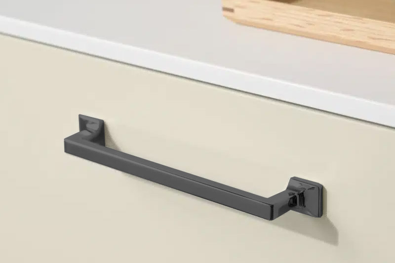 Uchwyt Pyramid firmy Furnipart to uchwyt meblowy przykręcany bezpośrednio do frontu — jego konstrukcja oparta jest na zamaku, co zapewnia trwałość i solidną podstawę. Jego charakterystyczną cechą jest smukła, opływowa rączka osadzona na „stopkach” o piramidalnym kształcie, które tworzą stabilną podstawę mocowania do mebla. To połączenie subtelnej formy z konstrukcyjną pewnością sprawia, że uchwyt wygląda nowocześnie, ale jednocześnie jest bardzo funkcjonalny.