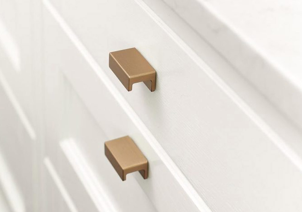Złote akcesoria meblowe dobrze sprawdzają się również w aranżacjach pokojowych i łazienkowych. W łazience harmonijnie komponują się z dodatkami w tym samym kolorze, takimi jak rama lustra czy wieszaki na ręczniki, tworząc spójną, elegancką całość. W pokojach natomiast świetnie wyglądają na białych frontach komód i szaf, zwłaszcza jeśli zestawione są z matową płytą o widocznej strukturze drewna, co pozwala uzyskać efekt stylowego, subtelnego kontrastu.