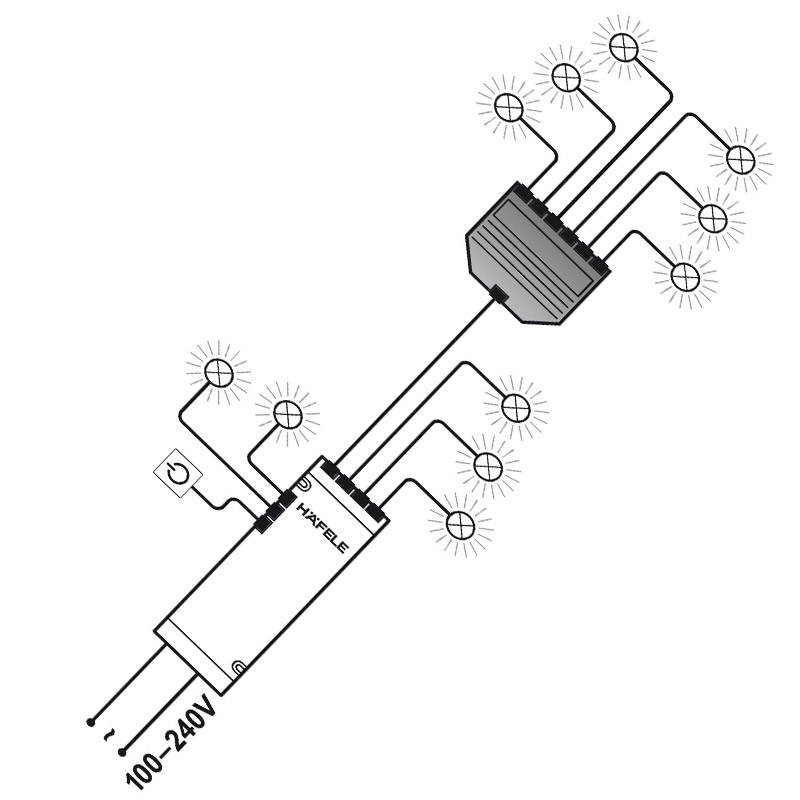 HAFELE -LOOX-UNI Sterownik wyłącznikówSterowanie 1 zasilaczem przez maks. 3 przełączniki. W ten sposób jeden zasilacz LED może być włączany i wyłączony przez różne przełączniki. Możliwość ustawienia 2 trybów pracy za pomocą zintegrowanego przełącznika. Połączenie krzyżowe: włączanie/wyłączanie za pomocą różnych przełączników Połączenie LUB: włączanie za pomocą przełączników 1, 2, lub 3. W celu wyłączenia ponownie nacisnąć wszystkie włączone przełączniki. |