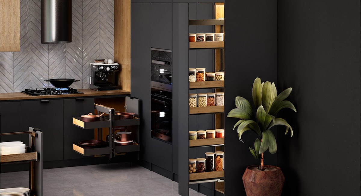 Pozbawione ścianki przedniej umożliwiają komfortowe wstawianie urządzeń, a jednocześnie – zapewniają łatwy do nich dostęp. Szuflady H=50 znakomicie sprawdzają się w spiżarkach i słupkach,