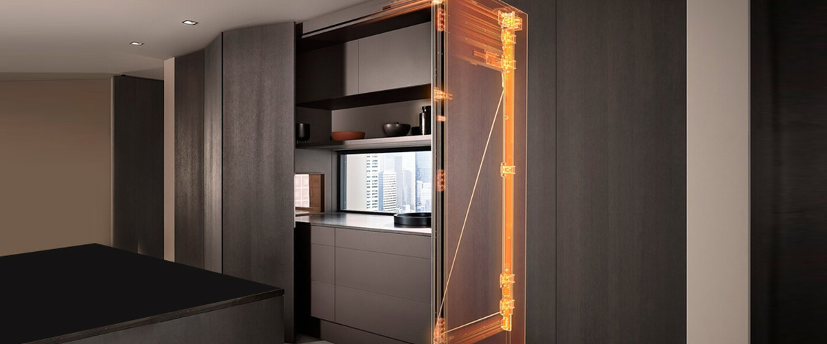 Szybkie chowanie całych stref - drzwi przesuwne, przesunwo-składane REVEGO są tak zaprojektowane, że całkowicie zasłaniają kieszeń oraz strefę funkcyjną, zachowując przy tym idealną szczelność. Otwarcie drzwi możliwe jest jednym delikatnym dotknięciem, a po skorzystaniu z wnętrza łatwo go z powrotem zamknąć.