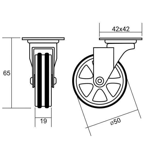 | Rolka łożyskowa ALEX ø50mm z hamulcem * materiał: stal / guma * łożyskowana * kolor rolki: szara * wymiar płytki montażowej: 70x55mm |