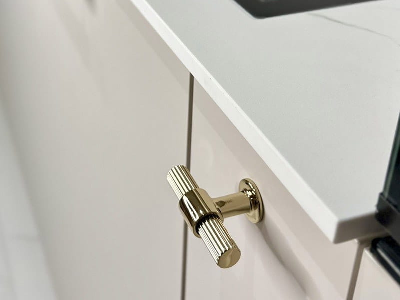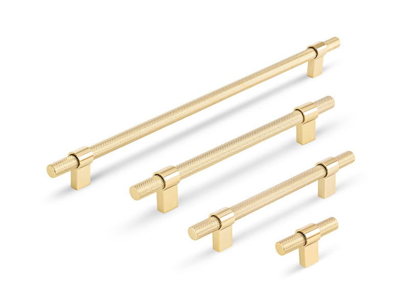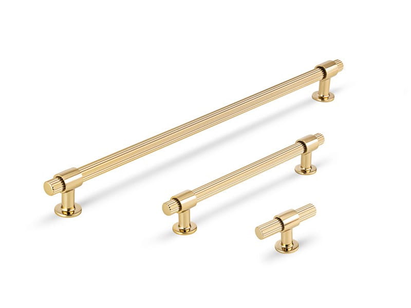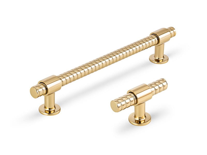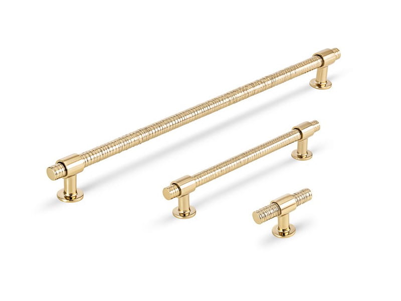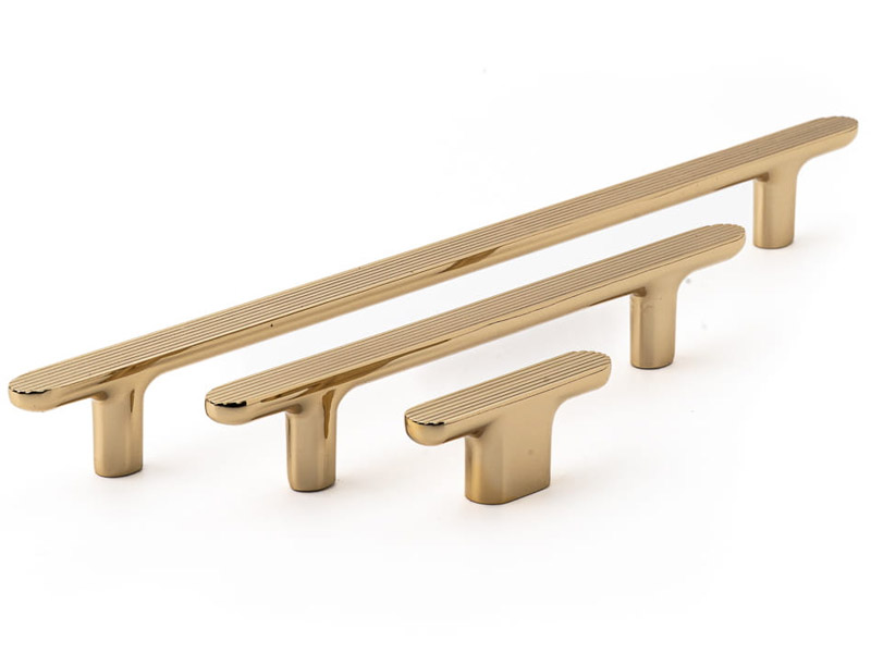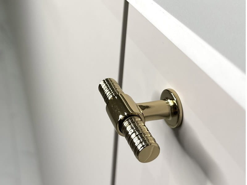 Gałki 8772 T-bar stanowią uzupełnienie tej kolekcji – zachowują ten sam charakter i detal wykończenia, jednak w bardziej kompaktowej formie. Cylindryczny kształt z radełkowaniem nadaje im wyjątkowy, biżuteryjny wygląd, który pięknie prezentuje się zarówno na frontach szuflad, jak i szafek. Złote wykończenie podkreśla ich luksusowy charakter i dodaje wnętrzu ciepłego blasku.