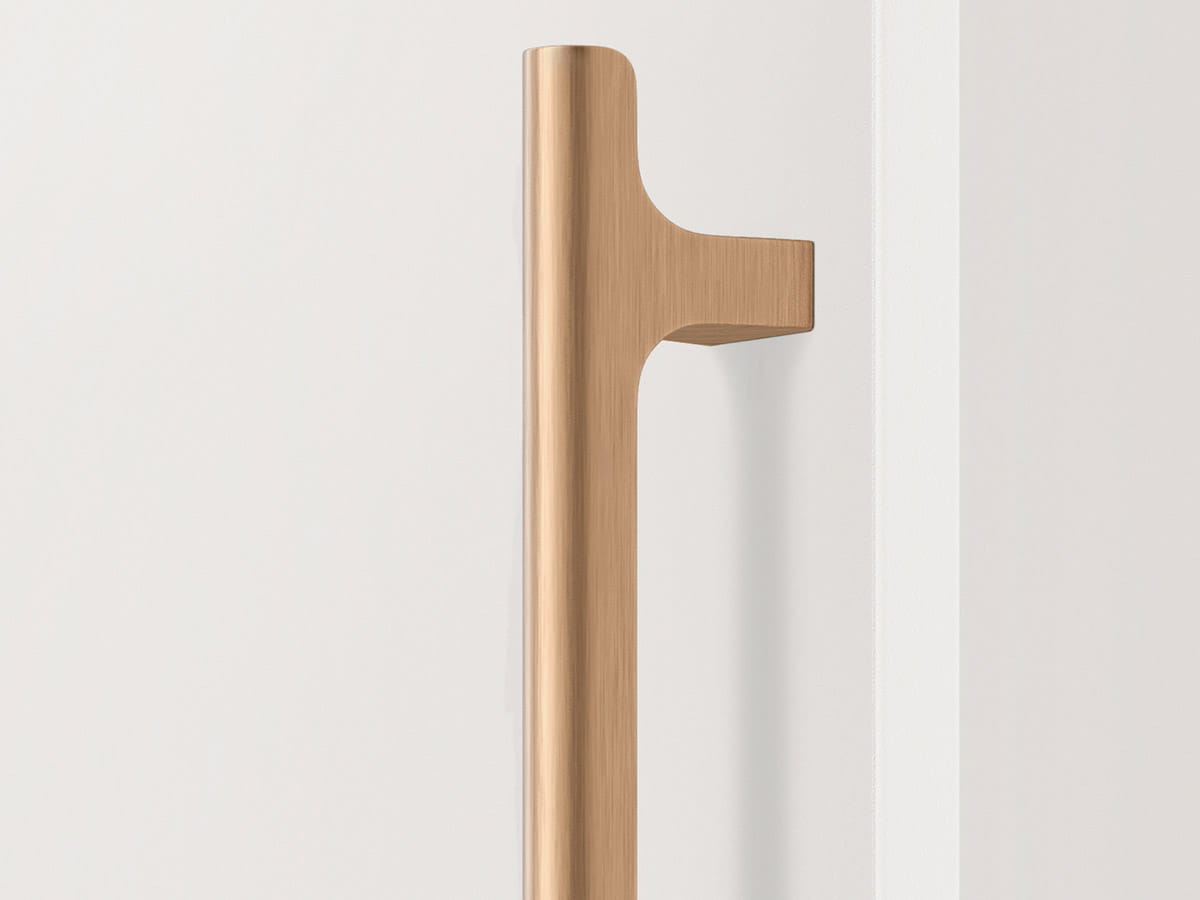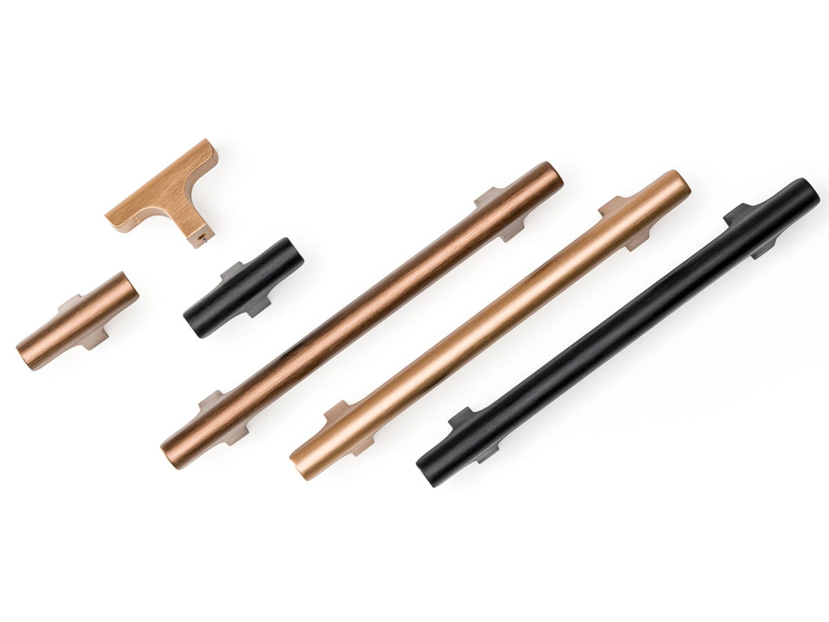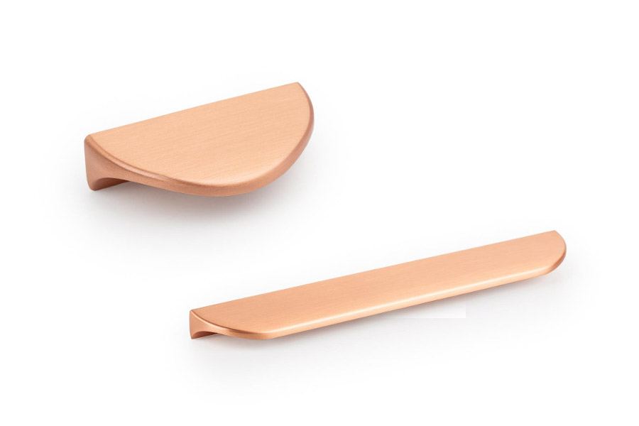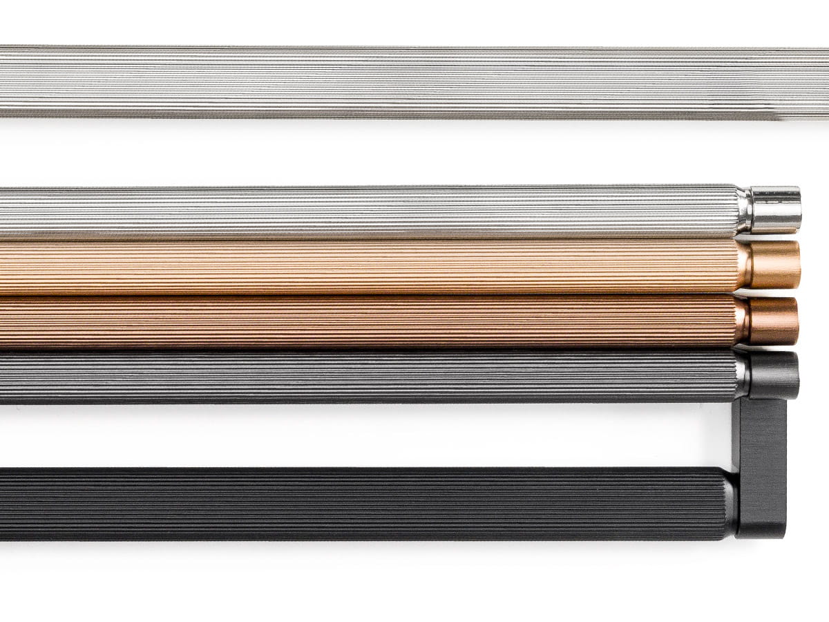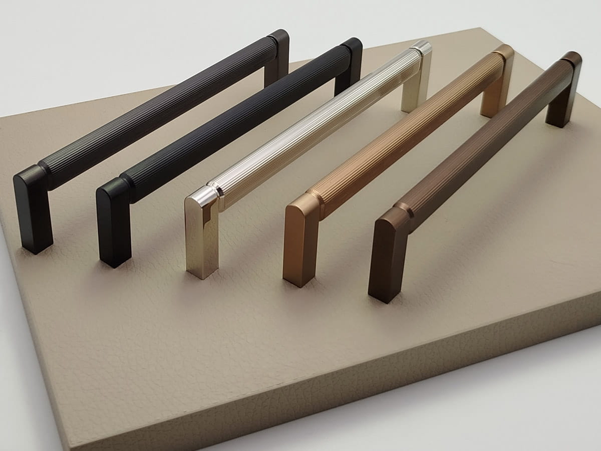 Dostępny jest w kilku wyrafinowanych wykończeniach: polerowany chrom, szczotkowany nikiel, szczotkowana miedź oraz szczotkowany mosiądz. Wersja w mniejszym rozmiarze pełni rolę gałki, co pozwala na ciekawe zestawienia – uchwyt i gałkę można łączyć na jednym meblu, tworząc spójną, ale dynamiczną kompozycję.