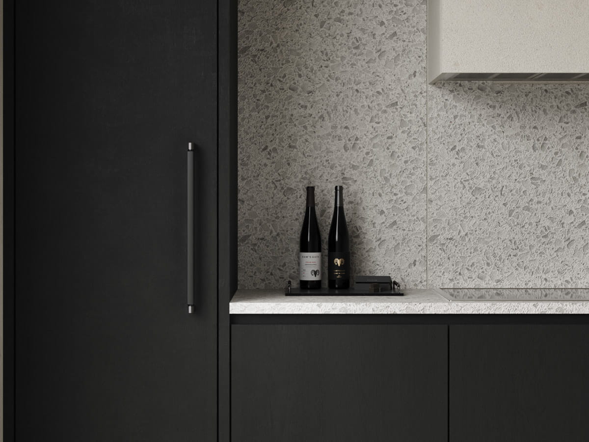 Casey Big wyróżnia się ciekawymi połączeniami faktur: teksturowana czerń lawy z matową czernią lub polerowaną czernią tytanową, a także teksturowany metaliczny brąz w zestawieniu z matowym brązem. Te zestawienia wprowadzają do projektów element luksusu i wyrazistego kontrastu, idealnie współgrając z gładkimi, stonowanymi frontami.