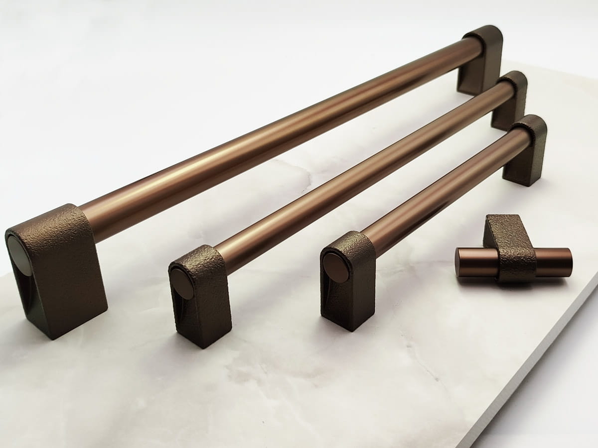 Model Casey urzeka eleganckimi połączeniami faktur: teksturowana czerń lawy w duecie z matową czernią, teksturowana czerń lawy z polerowaną czernią tytanową oraz teksturowany metaliczny brąz z matowym brązem. Te kontrasty nadają projektom głębi oraz subtelnej elegancji, szczególnie w zestawieniu z neutralnymi frontami.