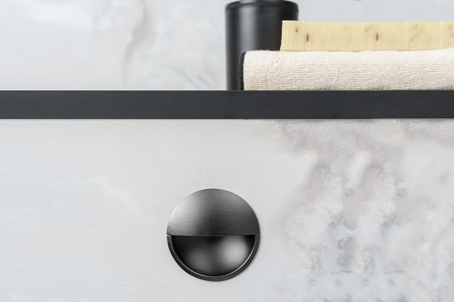 Dostępny w wersji jednostronnej i dwustronnej, uchwyt Moon to idealne rozwiązanie zarówno do drzwi przesuwnych, jak i wahadłowych. Jego szczotkowane czarne wykończenie podkreśla minimalistyczny charakter, natomiast warianty ze stali nierdzewnej oraz szczotkowanego mosiądzu wprowadzają do przestrzeni elegancki blask i szlachetne wykończenie.