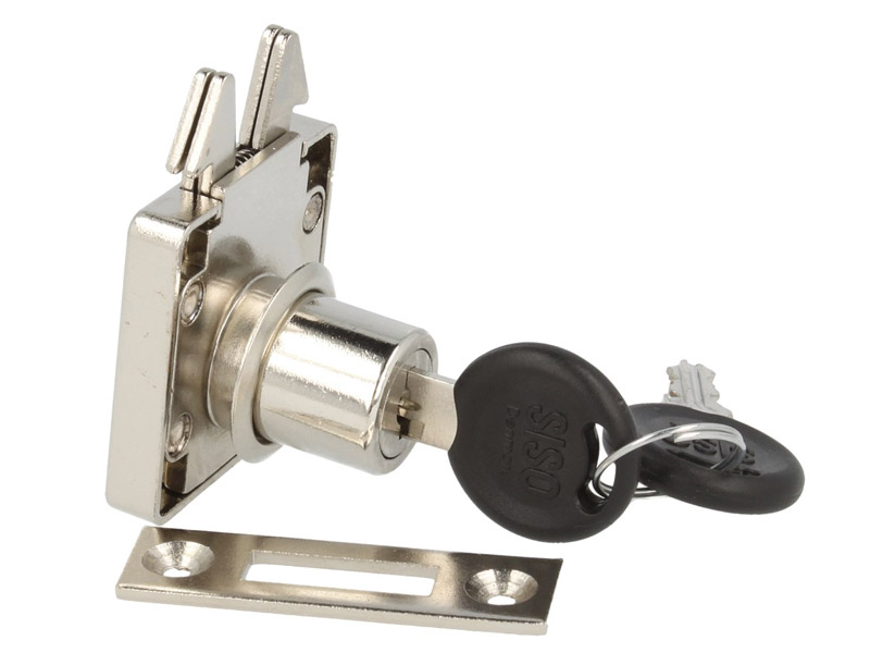 SISO-zamek kwadratowy zatrzaskowy X856M Wykończenie: niklowany Cylinder 19x22mm Zastosowanie: szuflady, minibary, szafy, kasy, szafki metalowe, itd. Skład jednego kompletu: jeden zamek (cylinder fi 19mm ) 1 rozetka, 1 płaska płytka zaczepowa, 2 klucze Działanie: dzięki zastosowaniu sprężyny połączonej z językiem zamka, zamknięcie następuje automatycznie po domknięciu drzwi szafki, obrót klucza powoduje otwarcie zamka dane techniczne | |