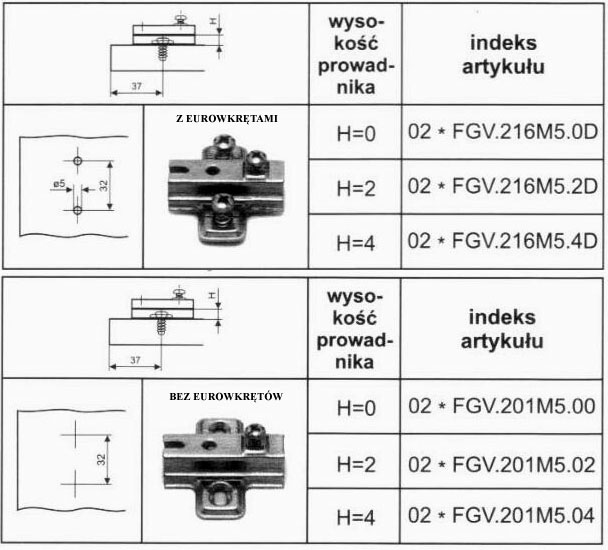 Prowadniki do zawiasów puszkowych serii "Slide On"![]() ![]() Zasady doboru wysokości prowadników do odpowiednich zawiasów serii "Slide On" | |||