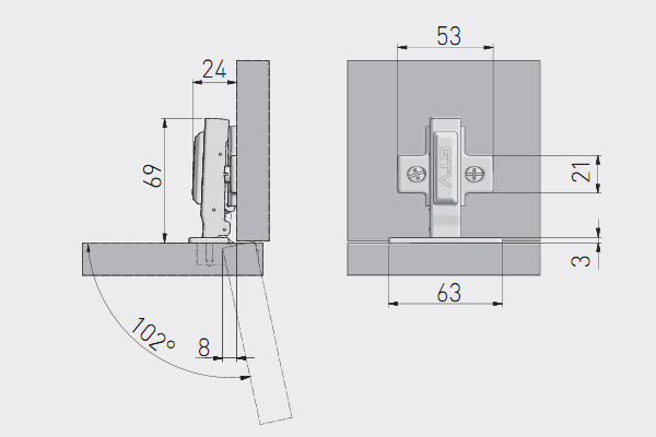 * spowalniający tłoczek hydrauliczny * kąt otwarcia 102° * do frontów o grubości od 16 do 18 mm * Średnica puszki ø35 mm * prowadnik H=0