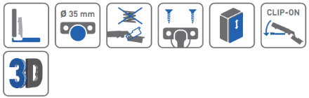Jego niewątpliwą zaletą jest możliwość precyzyjnej bezstopniowej regulacji w trzech płaszczyznach, dzięki której fronty będą idealnie ustawione na tej samej wysokości i w równych odstępach, a ich ruchy podczas otwierania i zamykania będą przebiegały harmonijnie i bez najmniejszych zakłóceń.